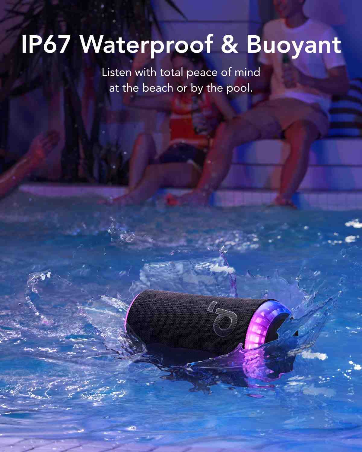 از نظر دوام و طراحی، بدنهی Soundcore Glow از مواد مقاوم و در عین حال سبک ساخته شده است. وزن آن بسته به نسخهی منطقهای بین 770 تا 900 گرم است و طراحی استوانهای آن باعث میشود حمل و جابهجایی آسانی داشته باشد. استاندارد مقاومت IP67 تضمین میکند که اسپیکر در برابر نفوذ گرد و غبار کاملاً مقاوم است و میتواند در برابر غوطهوری موقت در آب نیز دوام بیاورد. این ویژگی آن را برای استفاده در ساحل، استخر، طبیعت و محیطهای مرطوب مناسب کرده است.