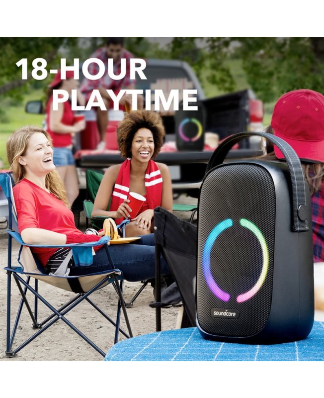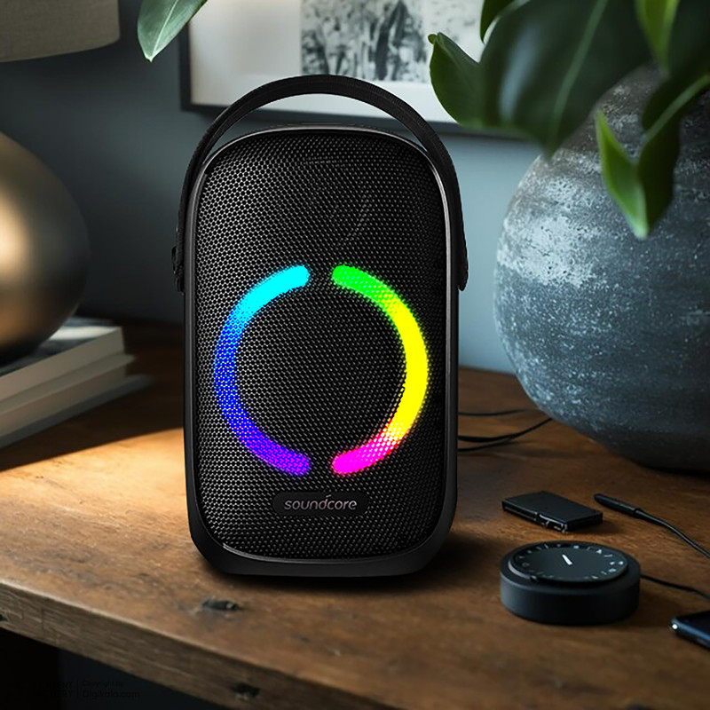 در قسمت جلویی اسپیکر، حلقههای نوری LED با قابلیت تغییر رنگ تعبیه شدهاند که با ریتم موسیقی تغییر حالت میدهند. این نورها دارای چندین حالت تنظیم هستند و از طریق اپلیکیشن اختصاصی Soundcore App میتوان شدت نور، الگوها و ترکیب رنگها را شخصیسازی کرد.