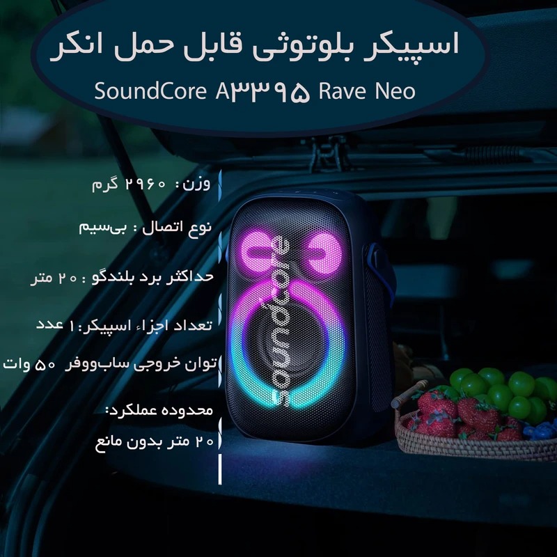 حتماً — در ادامه مشخصات فنی کامل و توضیحی اسپیکر Anker Soundcore Rave Neo مدل A3395 را بهصورت کاملاً متنی، روان، دقیق و حرفهای آوردم. این نسخه برای بخش توضیحات فنی سایت فروشگاهی یا معرفی محصول در دیجیکالا و سایتهای مشابه کاملاً مناسب است و بهجای جدول، تمام جزئیات را بهصورت توضیحی و طبیعی بیان میکند: