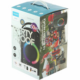 رنگ بدنهی این اسپیکر مشکی مات با حلقهی نور چندرنگ RGB است که جلوهای مدرن و جذاب دارد. درون جعبه محصول، یک کابل شارژ Type-C و دفترچه راهنمای کاربر قرار دارد.