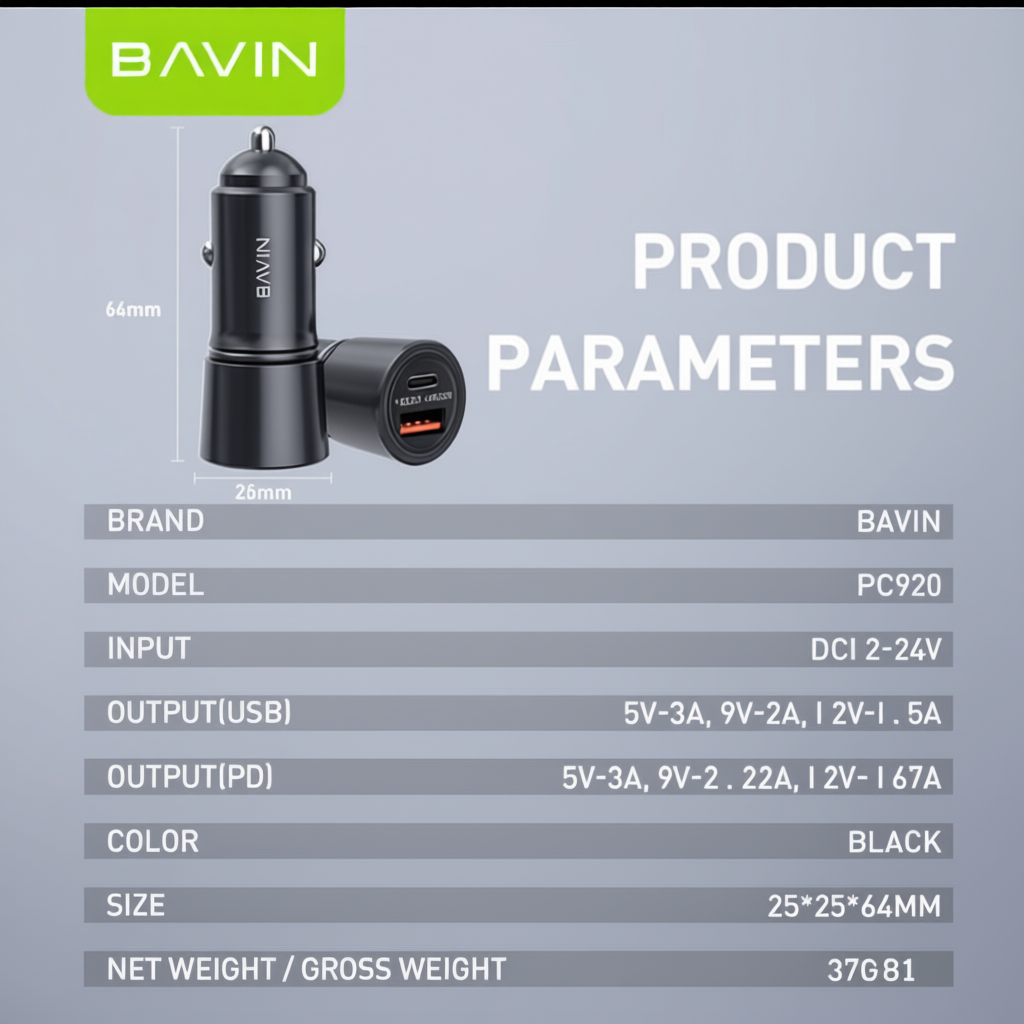 شارژر فندکی 38 وات باوین مدل PC920 38w فست شارژ