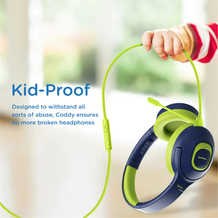 Promate CODDY.EMR دارای طراحی Over-Ear (رویگوش) با پدهای نرم چرمی و هدبند قابل تنظیم است تا در طولانیمدت گوش و سر کودک را خسته نکند.