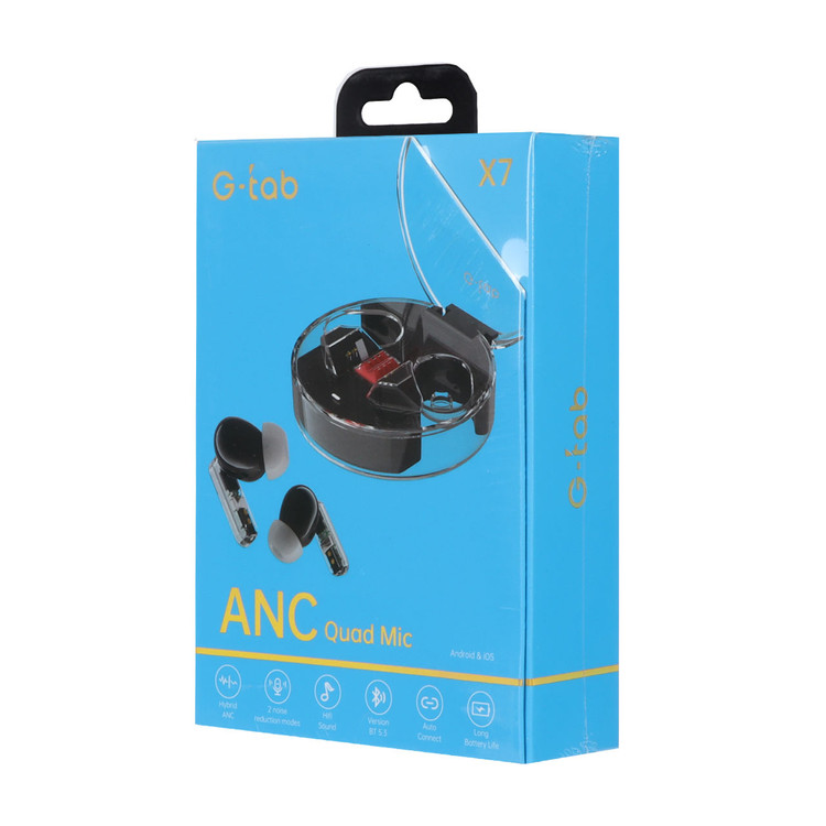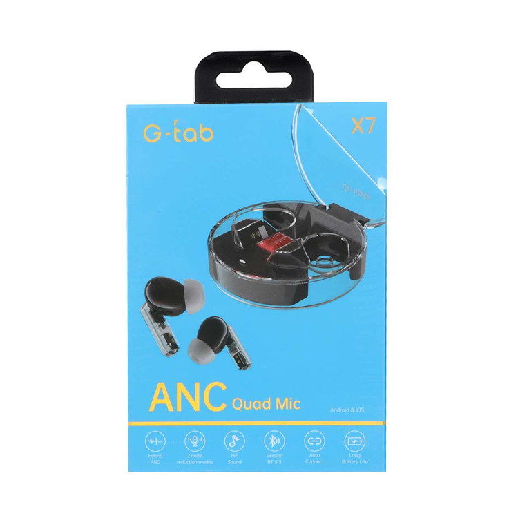 طراحی G‑Tab X7 روی گوش (in-ear / semi in-ear) با وزن سبک و راحت، استفاده طولانیمدت را بدون ایجاد خستگی ممکن میسازد. کنترل لمسی تعبیه شده روی ایربادها امکان مدیریت تماسها، پخش موسیقی و تغییر حالت نویزکنسلینگ را بهسادگی فراهم میکند.