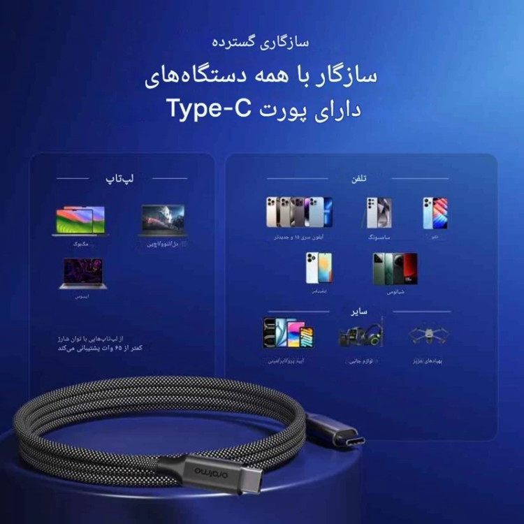 در این مدل، هر دو سر کابل از نوع Type-C است که با دستگاههای جدید سامسونگ، شیائومی، هوآوی، گوگل پیکسل، مکبوک و لپتاپهای مجهز به پورت Type-C سازگاری کامل دارد.