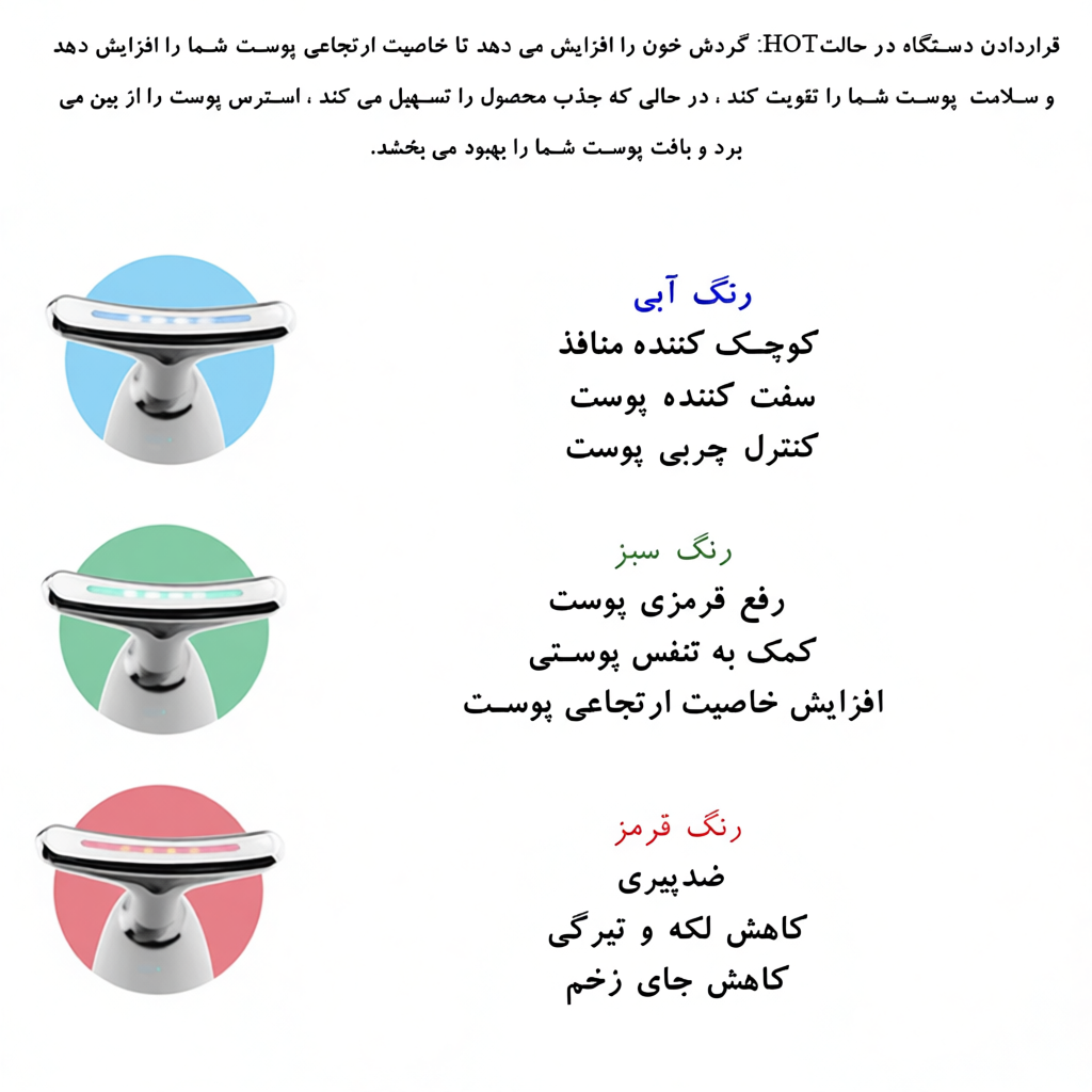 1. چندکاره بودن: دستگاه نه فقط ماساژ گردن بلکه صورت را نیز هدف قرار میدهد و با فناوری LED همراه است که برای بهبود رنگ و بافت پوست کاربرد دارد.