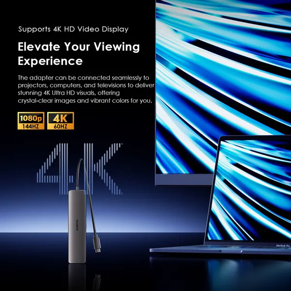 تصویر 4K با کیفیت بالا: پورت HDMI این هاب میتواند محتوای ویدیویی را با رزولوشن تا 4K@60Hz نمایش دهد؛ همچنین سازگار با رزولوشنهای پایینتر مثل 1080p، 720p و غیره است.
