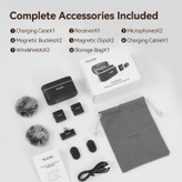 همراه با لوازم جانبی مثل گیره یا کلیپ مغناطیسی، کاور ضد باد (windshield)، کابل شارژ و کیف حمل — برای استفاده راحت و حرفهای.