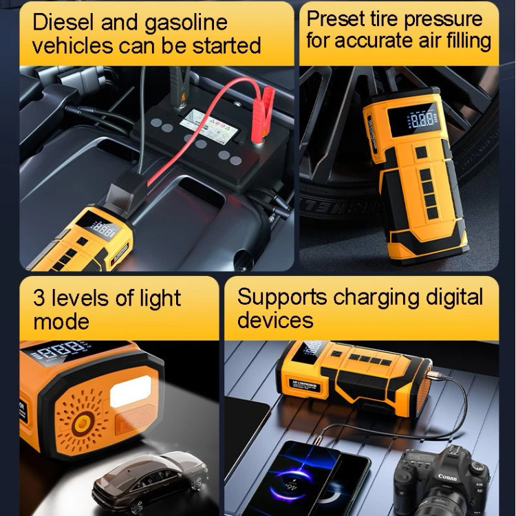 1. طراحی سه در یک: دستگاه پمپ هوا یکپارچه منبع تغذیه اضطراری خودرو، استارت اضطراری خودرو و کمپرسور هوا و پاوربانک را در یک دستگاه جمع و جور ترکیب می کند و راحتی زیادی را برای علاقه مندان به تعمیر و نگهداری خودرو فراهم می کند.