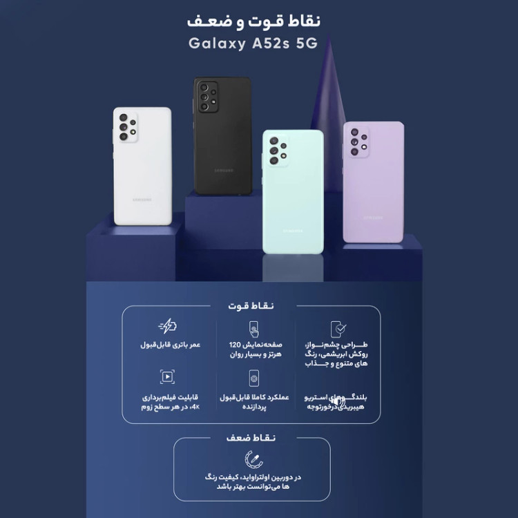 گوشی Samsung Galaxy A52s 5G یکی از موفقترین میانردههای قدرتمند سامسونگ است که تعادل کاملی میان عملکرد، زیبایی و امکانات پرچمدارگونه ارائه میدهد.
