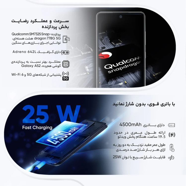این مدل با پردازندهی قوی Snapdragon 778G، نمایشگر 120 هرتز، دوربین 64 مگاپیکسلی با OIS، طراحی زیبا، باتری بادوام و پشتیبانی از 5G، تجربهای نزدیک به گوشیهای پرچمدار ارائه میدهد.