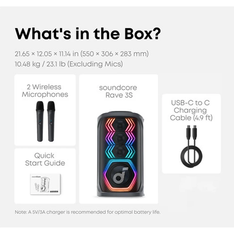 یکی از نقاط قوت اصلی Soundcore Rave 3S قابلیت کارائوکه AI است. این اسپیکر با استفاده از هوش مصنوعی میتواند صدای خواننده را از آهنگ حذف کند و آن را به یک ترک مناسب کارائوکه تبدیل کند. وجود دو میکروفون بیسیم داخل جعبه، افکت ریورب و تنظیمات صوتی مخصوص آواز، این مدل را به گزینهای عالی برای اجرای زنده، دورهمیهای خانوادگی و جشنها تبدیل کرده است. همچنین ورودی 6.35 میلیمتری امکان اتصال میکروفون یا گیتار باسیم را هم فراهم میکند.