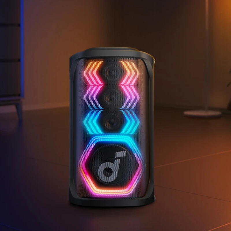 نورپردازی RGB چندحالته با ریتم موسیقی هماهنگ میشود و فضای مهمانی را کاملاً زنده میکند. افکتهای نوری متنوع از طریق دکمههای روی دستگاه یا اپلیکیشن Soundcore قابل کنترل هستند و جلوهای حرفهای به محیط میدهند.