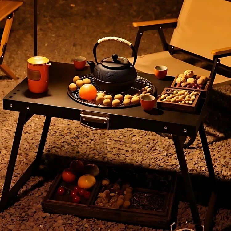 طراحی تاشو میز یکی از هوشمندانهترین بخشهای آن است. پایهها کاملاً جمع میشوند و میز در حالت بسته به یک حجم فشرده تبدیل میشود. این موضوع باعث میشود حمل آن در صندوق عقب خودرو، وسایل سفر یا حتی نگهداری در فضای کوچک خانه بدون دردسر باشد. وزن کم و تعادل مناسب پایهها، هم حمل را آسان میکند و هم هنگام استفاده، ثبات خوبی روی زمین ایجاد میکند.
