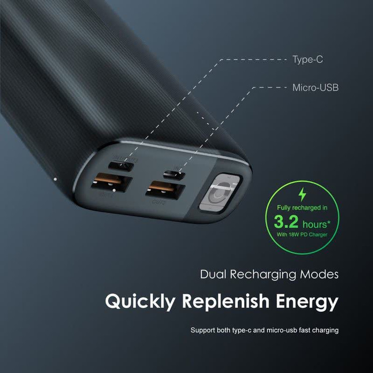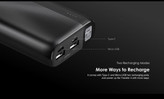 این مدل دارای دو پورت خروجی USB-A با فناوری شارژ هوشمند است که بهطور خودکار جریان مورد نیاز هر دستگاه را تشخیص داده و با بالاترین ایمنی ممکن شارژ میکند. همچنین وجود دو ورودی Micro USB و Type-C به کاربر این امکان را میدهد که با هر کابل موجود، پاوربانک را شارژ کند.