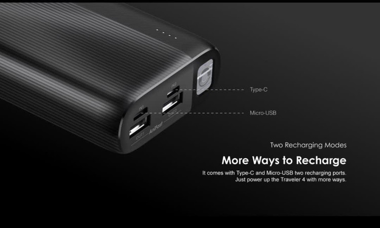 پاوربانک Traveler 4 به باتری لیتیوم-یونی قدرتمند مجهز است که ظرفیت اسمی آن 20000mAh است. این باتری میتواند یک گوشی هوشمند معمولی را بین 4 تا 6 بار (بسته به ظرفیت باتری آن گوشی) شارژ کند. به لطف خروجی 10.5 وات (5V/2.1A)، امکان شارژ نسبتاً سریع بسیاری از دستگاهها فراهم است.