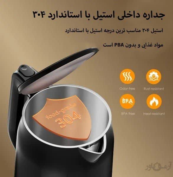 جنس داخلی کتری از استیل ضدزنگ گرید 304 است که کاملاً ضد رسوب، ضد بو و ضد زنگزدگی است. این امر باعث میشود طعم آب تغییر نکند و همیشه آب شفاف و سالمی در اختیار داشته باشید.