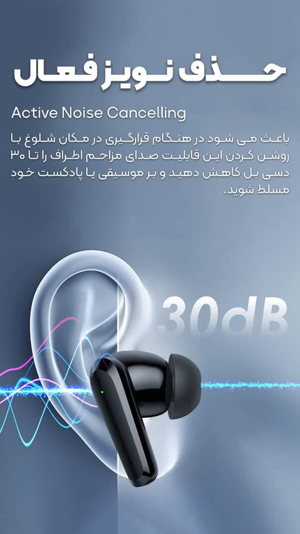 مجهز به فناوری ANC (Active Noise Cancellation) با قدرت حذف نویز تا حدود ۳۰ دسیبل. این قابلیت، صداهای مزاحم محیط مانند صدای مترو، خیابان یا محل کار شلوغ را بهطور قابل توجهی کاهش میدهد.